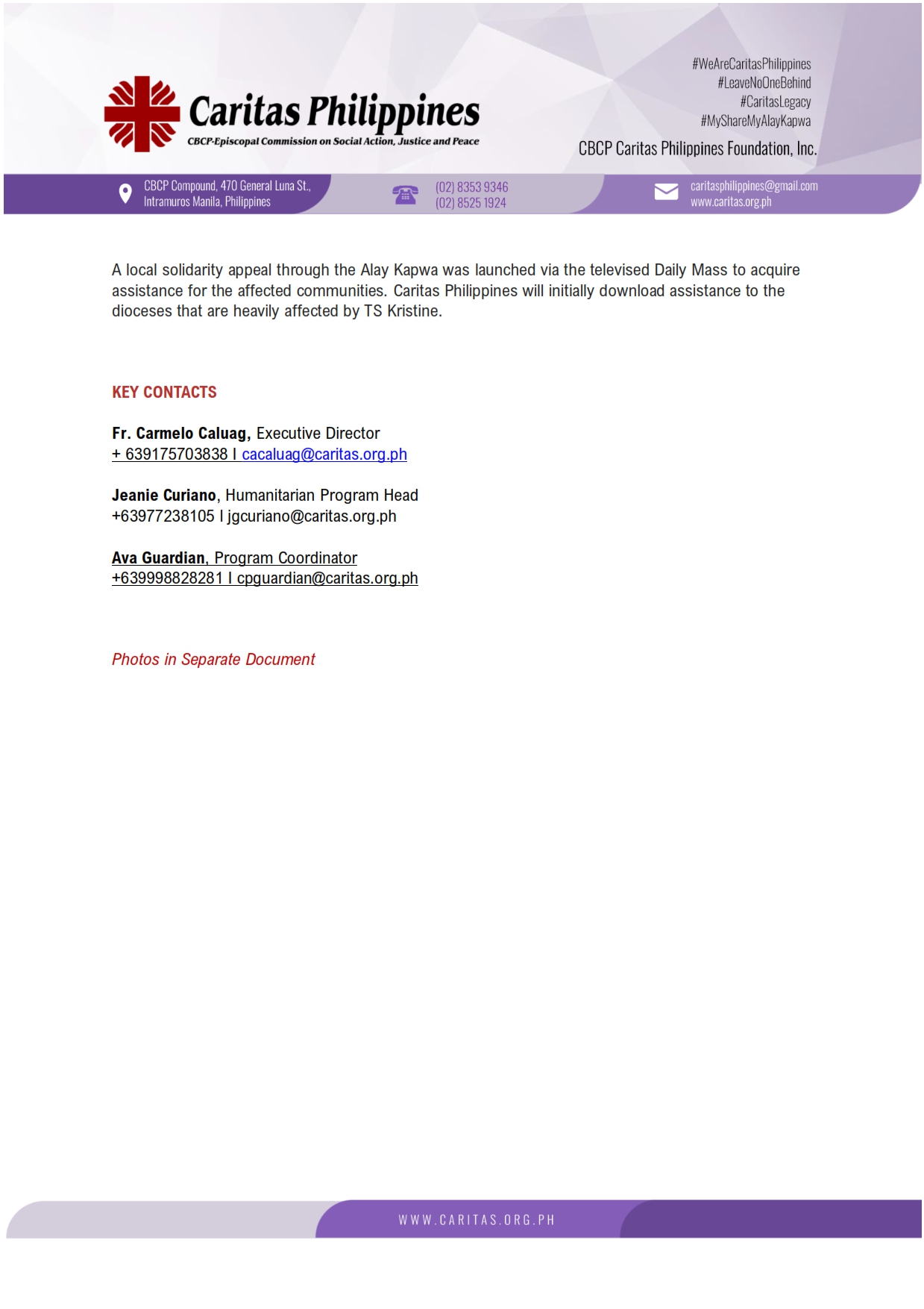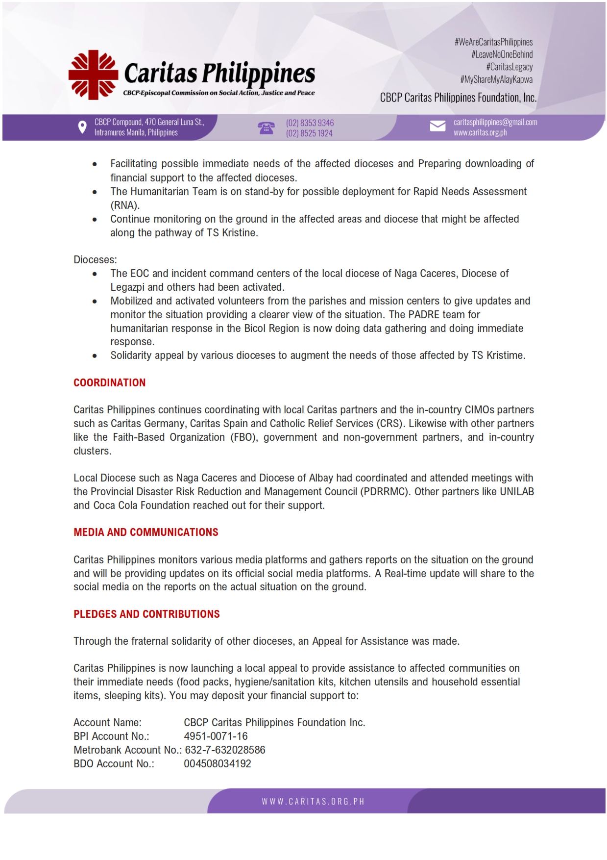 Let’s work together to provide food, potable water, hygiene kits, shelter, and hope to the country’s families and communities affected by Tropical Storm #KristinePH.