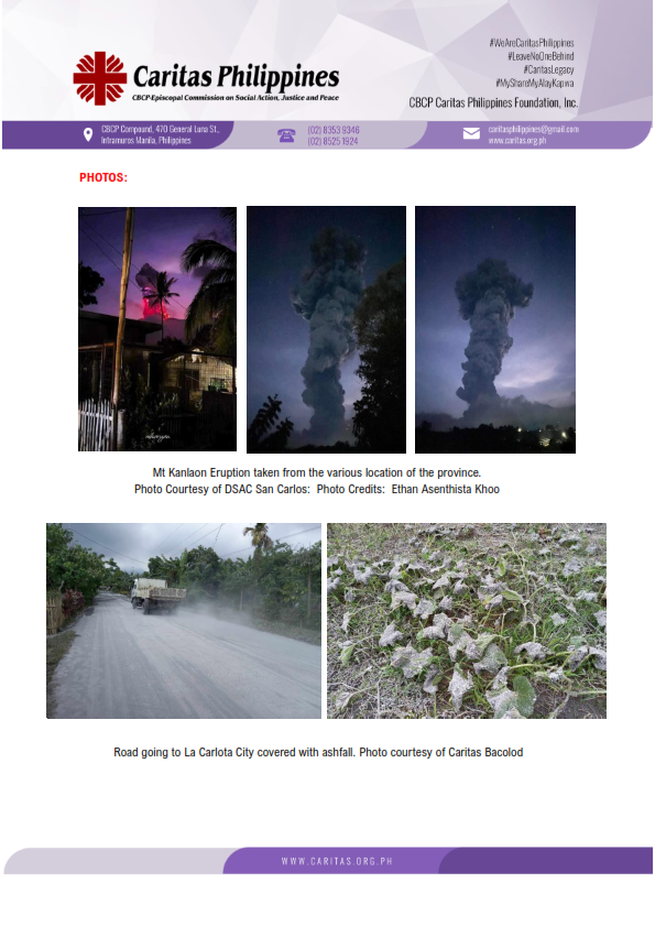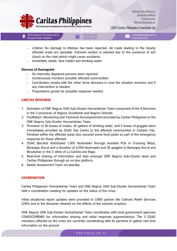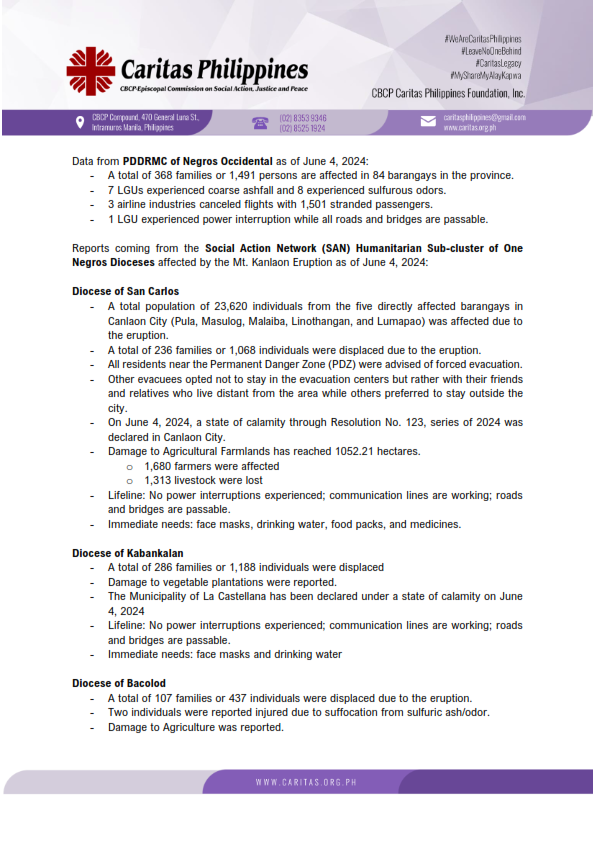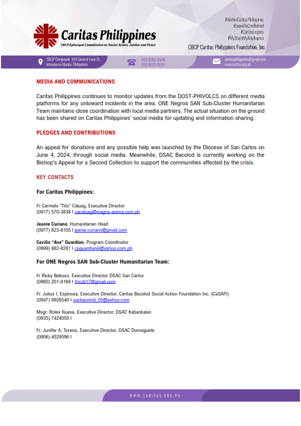 Caritas Philippines and the Social Action Network (SAN) Humanitarian Sub-Cluster of One Negros Dioceses are working together to respond to the eruption of Mt. Kanlaon, which began on June 3, 2024.